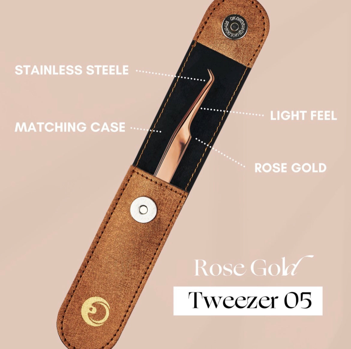 Rose gold, precise, light, volume, hand tested, come with case DVRG05 TWEEZER Item no. DVRG05 Color. Rose Gold. A range of high quality stainless steel tweezers. Materials. SUPER HARD, ANTI - MAGNETIC, ANTI0 ACID STEEL